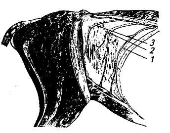 5) наружная косая мышца живота (m. obliquus abdominis extemus). Широким пластом мышечных волокон она направляется вниз и каудально, покрывая часть реберной стенки параллельно линии соединения ребер с их хрящами. Берет начало зубцами от задних краев нижних концов ребер, кроме первых четырех, и, перекидываясь через ребра, зубцы сливаются в общий пласт. Мышца оканчивается апоневрозом на маклоке, лонной кости (тазовая пластинка апоневроза) и белой линии (брюшная пластинка). От апоневроза отщепляется еще дополнительная бедренная пластинка, продолжающаяся на медиальную поверхность конечности как бедренная фасция. Тазовая пластинка вдоль ее заднего края усилена паховой связкой. Апоневроз мышцы сливается с желтой брюшной фасцией;