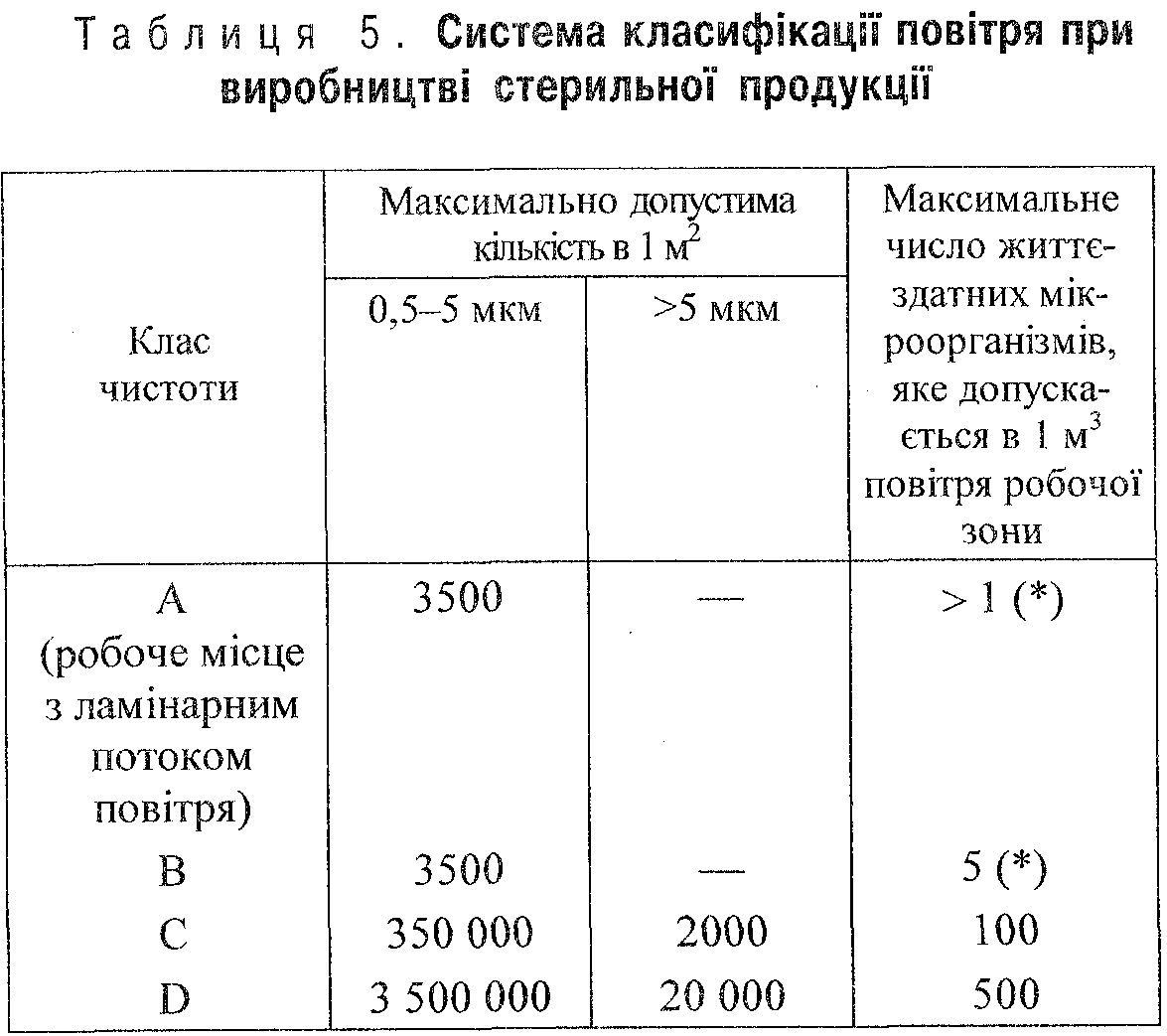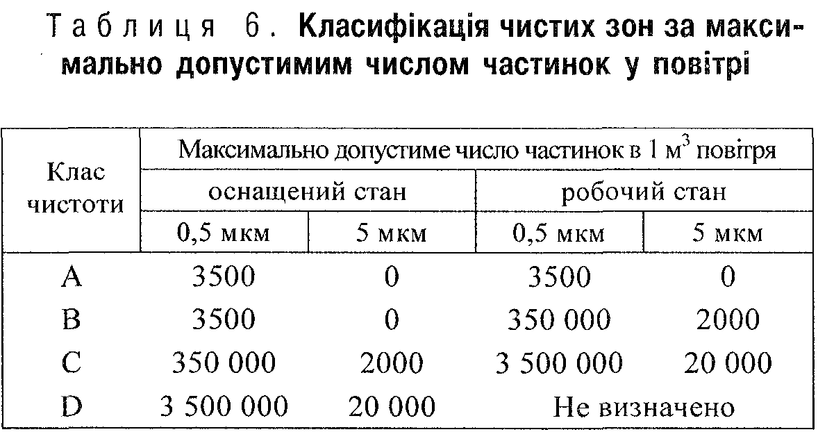 Відповідний ступінь чистоти повітря забезпечують на основі результатів валідації. Згідно з правилами належної виробничої практики Всесвітньої організації охорони здоров'я (СМР ВООЗ) чисті зони для виробництва стерильної продукції класифікують залежно від характеристик повітря на класи чистоти А, В, С і В (табл. 5).