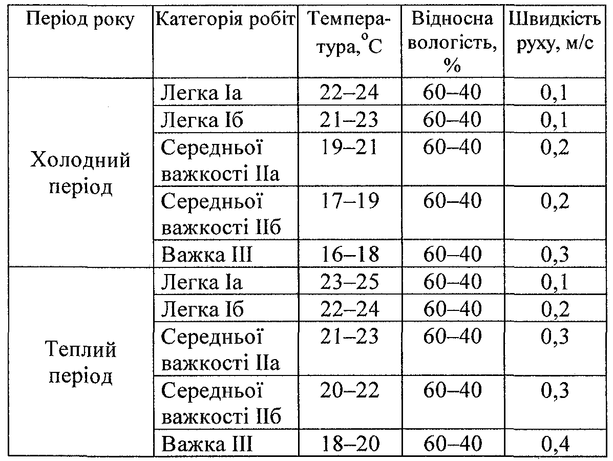 У виробничих приміщеннях періодично здійснюють мікробіологічний контроль і, за потреби, контроль повітря на вміст частинок або концентрацію відповідних речовин. Наведена нижче таблиця демонструє оптимальні величини температури, відносної вологості та швидкості руху повітря у робочій зоні виробничого приміщення: