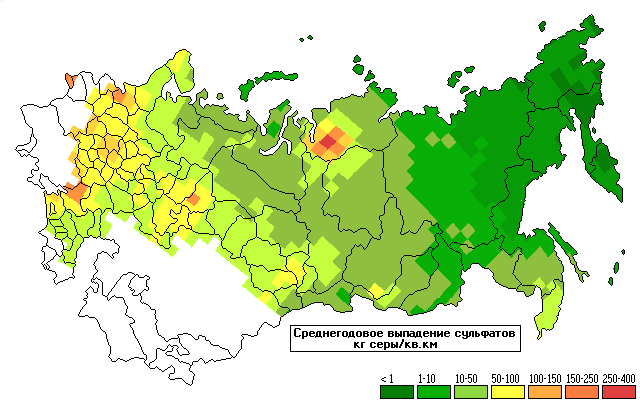По данным Росгидромета, ежегодно на территории России выпадает не менее 4.22 млн.т серы, 4.0 млн.т. азота (нитратного и аммонийного) в виде кислотных соединений, содержащихся в атмосферных осадках. Как видно из рисунка 10, наибольшие нагрузки серы наблюдаются в густонаселенных и индустриальных регионах страны.
