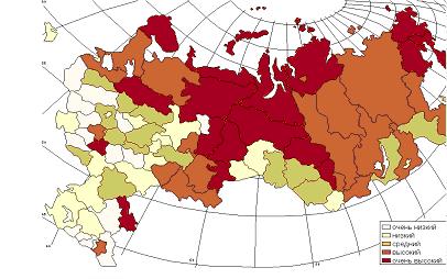 Территория России характеризуется большим разнообразием климатических условий, определяющих потенциал загрязнения атмосферы, т. е. перенос и рассеивание примесей, поступающих в воздушный бассейн города с выбросами предприятий и автотранспорта[8]. Они определяют «климат» качества воздуха и частоту эпизодов высокого загрязнения. Выделено пять зон с различными условиями рассеивания примесей. Низкий потенциал загрязнения наблюдается на северо-западе Европейской части России (зона I и II). Особенно неблагоприятные условия для рассеивания (очень высокий потенциал) создаются в Восточной Сибири (зона V).