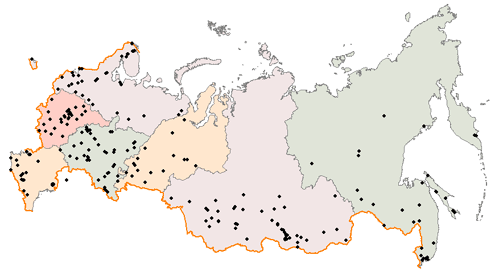 На территории большинства субъектов Федерации выпадение серы и нитратного азота от собственных источников не превышает 25% от их суммарных выпадений. Вклад собственных источников по сере превышает этот порог в Мурманской (70%), Свердловской (64%), Челябинской (50%), Тульской и Рязанской (по 40%) областях и в Красноярском крае (43%).