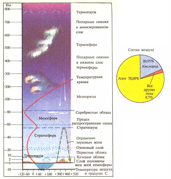 Атмосфера (от. др.-греч. ἀτμός - пар и σφαῖρα -шар), воздушная оболочка Земли, вращающаяся вместе с нею. Атмосфера — окружающая Землю газовая среда. Ее масса — около 5,5×1015т, или менее одной миллионной всей массы Земли. Толщина нижнего слоя атмосферы (тропосферы), содержащего около 80% ее массы, — от 8 км в полярных широтах до 18 км в экваториальном поясе. В стратосфере, расположенной на высоте до 55 км над поверхностью, находится до 20% массы атмосферы. Сухой воздух у поверхности Земли содержит по объему 73% азота и 21% кислорода, малые дозы аргона и углекислого газа[9].