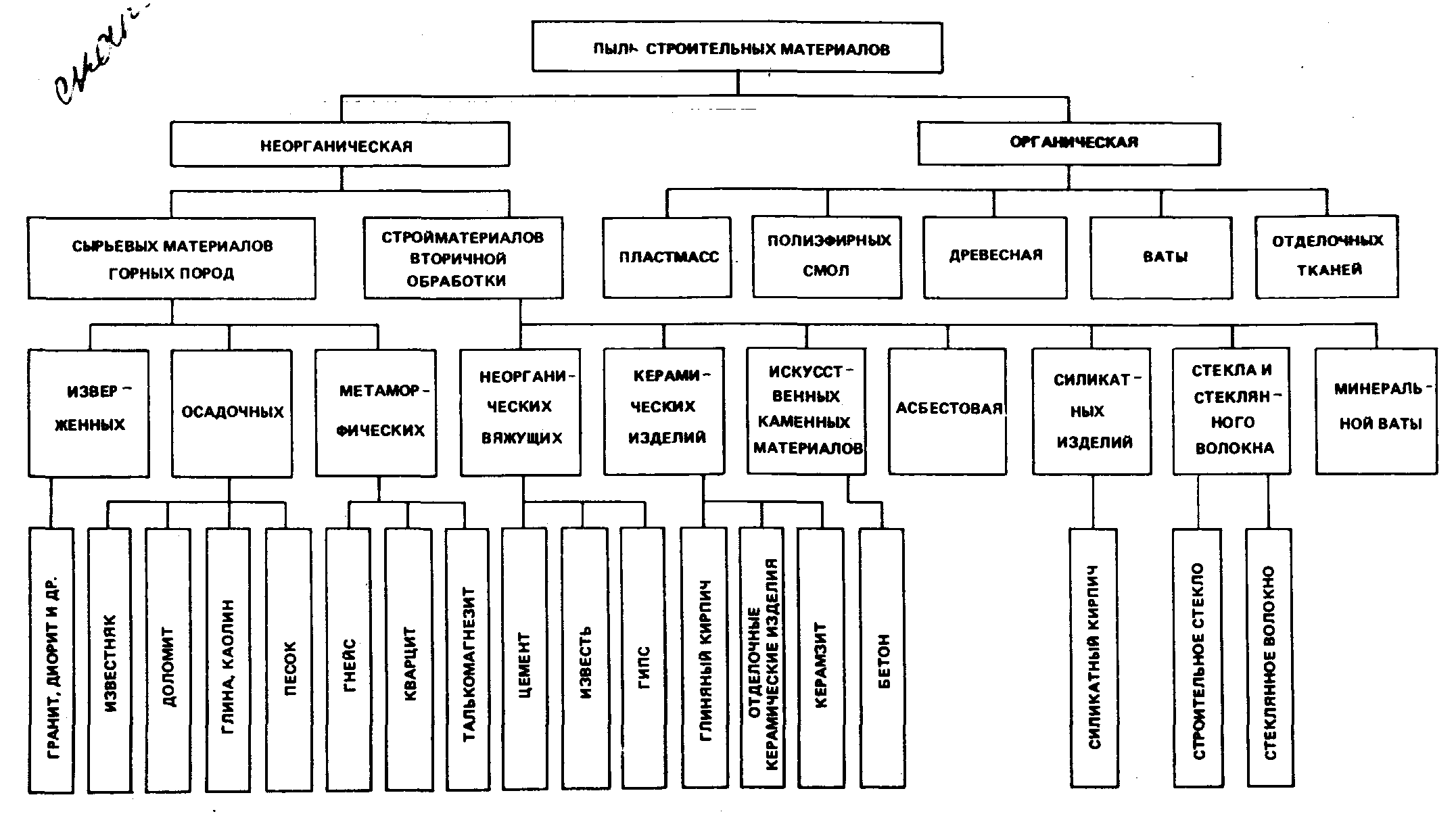 Пыль строительных материалов (см. схему) можно разделить на органическую и неорганическую (минеральную).