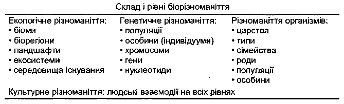 Таблиця 1.1. Склад і рівні біорізноманіття (За Хейвудом і Бастом, 1995)