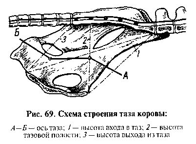 Роды у коровы. Таз коровы по сравнению с тазом животных других видов менее благоприятен для родового акта, Подвздошные кости поднимаются вверх почти под прямым углом, вследствие чего вертикальный диаметр таза располагается под 3—4-м крестцовым позвонком. Вход и таз имеет форму сплюснутого с боков овала. Поперечный диаметр тазовой полости значительно меньше среднего поперечного диаметра входа в таз. Седалищные гребни представляют собой костные пластинки, поднимающиеся кверху и составляющие значительную часть боковых стенок. Лишь сравнительно небольшой участок последних образован связками таза. Выход из таза с боков ограничен седалищными буграми в виде костных пластин, зажимающих плод при его продвижении кзади. Наконец, вогнутая поверхность крестца и неровное, с углублением, дно тазовой полости придают оси таза форму ломаной линии (рис, 69). Плод имеет максимальную ширину головы в области лобных костей; у него более короткие конечности, чем у жеребенка- Стадия раскрытия шейки матки продолжается до 12 ч. Корова ведет себя более спокойно, чем кобыла. Изредка продолжительно тихо мычит. Под влиянием сокращения матки через раскрытую шейку выпячивается плодный пузырь, состоящий из сосудистой и околоплодной оболочек или алланто-хориона. Плодный пузырь может выпячиваться за пределы вульвы и затем разрываться, но чаше плодные оболочки разрываются еще во влагалище и из родовых путей выступают предлежащие конечности.
