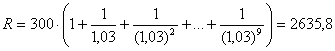 Решение. Дисконтируя ежемесячные платежи, найдем современную стоимость потока платежей. Учтем что годовая ставка 36%, а значит в месяц она составляет – 3%.Итак, запишем: первый платеж не дисконтируется R>1>= 300; R>2> = 300/(1,03), R>3> = 300/(1,03)2 … R>10> = 300/(1,03)9.