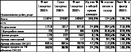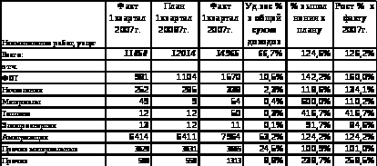 Рост расходов к плану составил 124,6%, в результате распределения общехозяйственных и общепроизводственных расходов по видам деятельности на прямые статьи затрат согласно новой номенклатуры «доходов и расходов» с 1.01.07г. по следующей зависимости:
