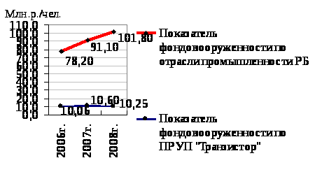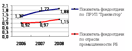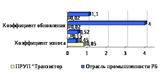 Представленные показатели свидетельствуют о том, что на ПРУП "Транзистор" в сравнении с показателями по отрасли промышленности Республики Беларусь имеет место значительный износ основных фондов, коэффициент годности по предприятию в 3,5 раза ниже, чем по отрасли промышленности. Возобновляется столько же основных средств, сколько и выбывает, в то время как по отрасли промышленности новые основные фонды направляются на пополнение действующих, что обеспечивает их значительный прирост.