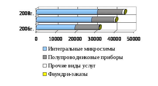 Динамика объема производства продукции по основным видам: интегральные микросхемы, полупроводниковые приборы (IGBT, биполярные транзисторы, диоды Шоттки, импульсные диодные матрицы, полевые транзисторы), потребительские товары и прочие виды изделий (КМОП преобразователь напряжения питания, контроллер постоянного напряжения и постоянного тока для адаптеров и зарядных устройств) за 2006-2008 гг. представлена в таблице 2.5.