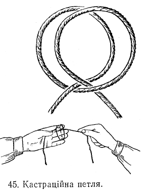 Встановлено, що кролі часто втягують сім'яники в черевну порожнину. В подібних випадках треба підняти тварину за передні кінцівки, після чого сім'яники вийдуть з пахвинних ходів у мошонку. Захопивши останню великим і вказівним пальцями лівої руки, відтягують її і сім'яник до себе. У задньому верхньому кінці мошонку розсікають разом із загальною піхвовою оболонкою і вилущують сім'яник. Потім розрізають мошонкову зв'язку. Сім'яний канатик перетягують лігатурою (тонкою шовковою або шпульковою ниткою № 10). Для перев'язки канатика застосовують кастраційну петлю (рис. 45).