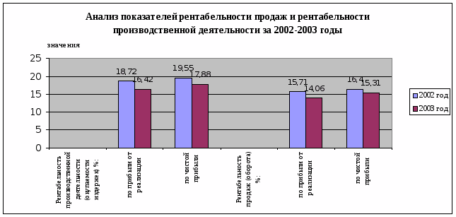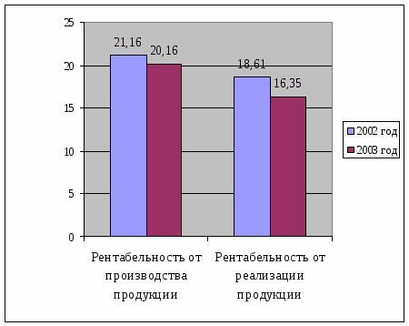 Таблица 2. Анализ уровня рентабельности от производства продукции и рентабельности реализации продукции за 2002-2003 годы