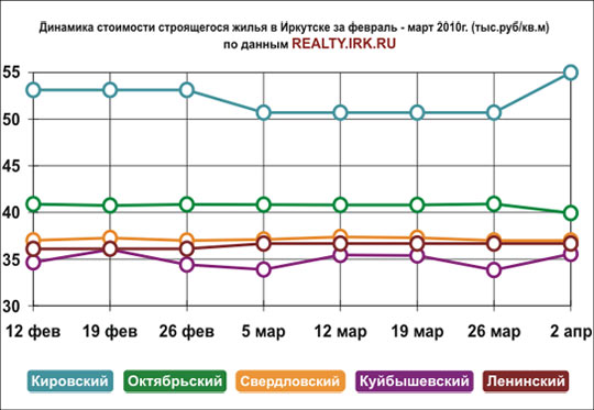 За последние две недели весны (с 14 по 28 мая 2010 года) квартиры на вторичном и на первичном рынках в Иркутске подешевели, по данным портала REALTY.IRK.RU, в среднем на 0,1%. Среди готового жилья только квартиры в Кировском районе немного подорожали, но снижение цен в остальных районах перекрыло этот рост. Новостройки в трех районах Иркутска не изменились в цене, зато в Октябрьском подешевели сразу на 0,6%.