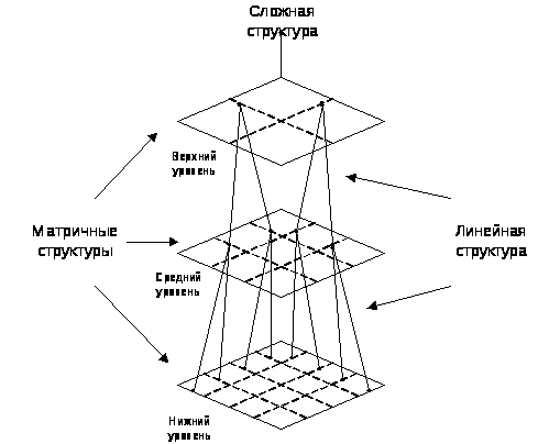 Под сложной структурой понимается многопараметрическая матричная организация, отдельные звенья которой упорядочены по принципу иерархии. Система сочетает достоинства как линейной, так и матричной организации. На рис. 1 представлена графическая интерпретация проектирования сложной организационной структуры, включающую среди своих элементов также матричную и линейную структуру.