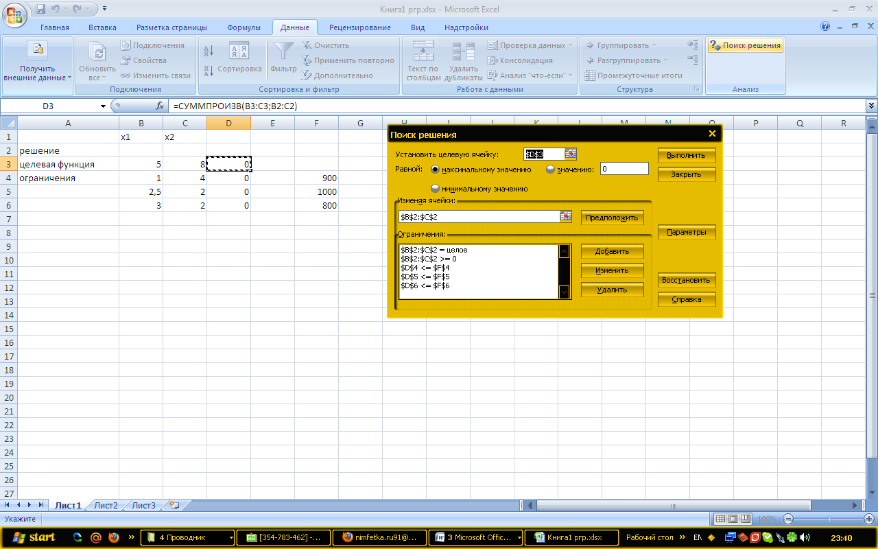 Проверка результатов решения задачи в среде MS Excel показала аналогичное решение данной задачи оптимизации.