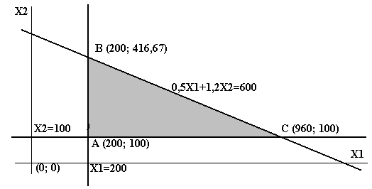 Ограничение X1 ≥ 200 задается вертикальной линией X1=200. Все точки (X1; X2), расположенные справа от этой линии, удовлетворяют ограничению X1 ≥ 200, расположенные слева – не удовлетворяют. Ограничение X2 ≥ 100 задается горизонтальной линией X2=100. Все точки, расположенные сверху от этой линии, удовлетворяют ограничению X2 ≥ 100, расположенные снизу – не удовлетворяют.