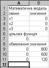 2. Завантажити табличний процесор Excel і увести математичну модель задачі.