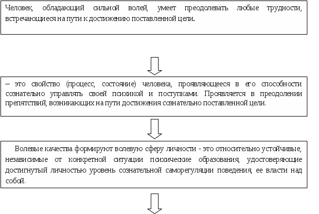 Воля – это свойство (процесс, состояние) человека, проявляющееся в его способности сознательно управлять своей психикой и поступками. Проявляется в преодолении препятствий, возникающих на пути достижения сознательно поставленной цели.