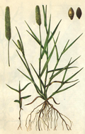 Щетинник зеленый (Setaria viridis). Малолетний поздний яровой сорняк (рисунок 4). Высота растения достигает 20…100 см. в начальные периоды растет медленно. Одно растение дает до 5…7 тыс. зерновок. Семена прорастают когда температура почвы достигает 15°С и более. В почве они могут сохранять жизнеспособность 7…10 лет. В посевах яровой пшеницы, кроме зеленого распространен щетинник сизый, который отличается антоциановой окраской некоторых частей растения.