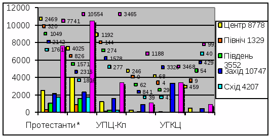 Таким чином, питома вага протестантів у загальній масі віруючих різних церков України набагато менше питомої ваги створених ними громад у загальноукраїнській конфесіональній конфігурації. Якщо порівняти, скажемо, офіційні повідомлення Всеукраїнського Союзу ЕХБ, Уніонної конференції АСД України і верховного архієпископа УГКЦ, то на одну баптистську громаду приходиться 59 членів, на одну адвентистську – 106, а на один прихід Івано-Франківської єпархії УГКЦ – відповідно до церковного (нехай і серйозно завищеної) статистикою – 1072 вірних, Львівський архієпархії – 2462, Тернопільско-Зборовскій – 757 [20;83-86-89]. Це, як бачимо, цифри різного порядку, навіть якщо погодитися, що для дуже багатьох осіб декларування своєї приналежності до церков більшості – досить формальний акт. У 1985 р. на 10 тис. міського населення України припадало 29 членів протестантських громад, на 10 тис. сільського – 43. В наступні роки ситуація, звичайно, змінювалася, але не радикально. Наприклад, протягом 4 років (1994–1997 р.) кількість громад ВСОЕХБ виросло на 579, тобто майже в півтора рази. Збільшення ж членів братерства було менш динамічним – з 105807 до 120346, тобто на 20%.