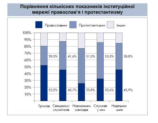 Отже, питома вага протестантів у загальній масі вірних різних церков України набагато менша ніж питома вага створених ними громад у загальноукраїнській конфесійній конфігурації. Скажімо, якщо порівняти офіційні, датовані першою половиною 1990-х рр. повідомлення Всеукраїнського Союзу ЄХБ, Уніонної конференції АСД України та верховного архієпископа УГКЦ, то на одну баптистську громаду припадає 82 члени, на одну адвентистську – 106, [126;24] а на одну парафію Івано-Франківської єпархії УГКЦ - згідно з церковною (хай і серйозно завищеною) статистикою - 1448 вірних, Львівської архієпархії - 1844, Тернопільської - 1899. У 1985 р. на 10 тис. міського населення України припадало 29 членів протестантських громад, на 10 тис. сільського - 43.