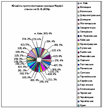 На початок 2003 року в Україні офіційно функціонувало 6827 протестантських організацій; протестантами було створено 43% (65) духовних навчальних закладів країни і близько 35% всіх недільних шкіл. 39,4% загальної кількості протестантських громад належить до євангельських християн-баптистів (переважно це громади українського об’єднання ЄХБ - 2272); 27,4% - до п'ятидесятницьких течій, найбільшим з-поміж яких є Союз ХВЄ України – 1367 грамад; 13% - до свідків Єгови; 14% - до Уніонної конференції АСД. Всі інші протестантські громади (реформати Закарпаття, методисти німецькі) українські і шведські лютерани, пресвітеріани та ін.) разом складають 6,2% загальної кількості протестантських громад. Найбільш насиченими протестантськими спільнотами в Україні п Волинські і Північні області (відповідно 11 і 15 % із всіх протестантських громад країни, Поділля і Степ - по 9% [82;55-56]. Протестантські громади не є надто численними. В середньому нараховують приблизно 100 членів. Причому, якщо громади у великих містах часом мають понад 1000 членів (у Союзі ЄХБ таких громад в середині 90-х рр. було вісім), то в багатьох селах Північно-Східної та Центральної України діють дуже нечисленні громади, переважно з літніх і похилого віку віруючих, які підтримують відповідний рівень духовного життя не в останню чергу завдяки опікуванню міських громад.