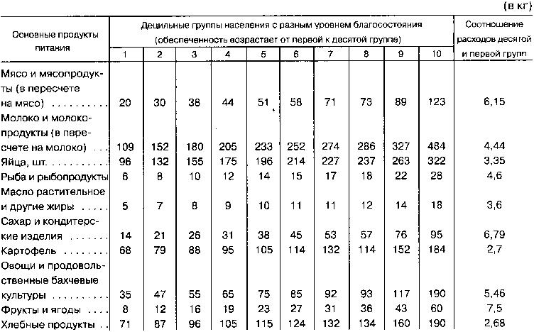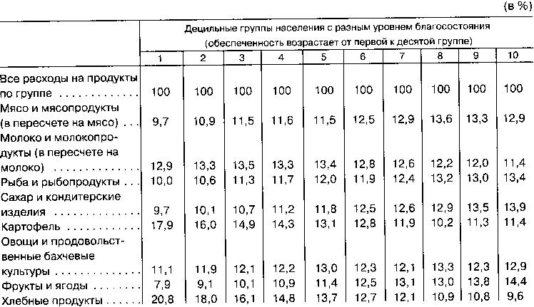 Доля в совокупных расходах на питание по децильным группам менялась от 3,5% в первой, наименее обеспеченной группе, до 19,3% в последней — наиболее обеспеченной (разница свыше 450%). В первых четырех группах наибольшие доли расходов приходятся на хлебные продукты, картофель, молоко и молочные продукты. В пятой и шестой группах приоритетность этих продуктов еще сохраняется, но их доли сильно приближены к долям других продуктов. Начиная с седьмой группы, приоритетность продуктов кардинально меняется. Обеспеченное население больше тратит на покупку фруктов и ягод, мяса, рыбы, сахара и кондитерских изделий. Если сравнить потребление десятой и первой децильных групп, то расходы на покупку фруктов и ягод в десятой группе больше в 10,4 раза, сахара и кондитерских изделий — в 8,1, мяса — в 7,6, рыбы — в 7,6, овощей и бахчевых культур — в 6,6, молока и молокопродуктов — в 5, картофеля — в 3,6, хлебных продуктов в 2,6 раза. Даже такие продукты питания, как хлебные изделия, картофель, молоко и молочные продукты, обеспеченное население потребляет в несколько раз больше малообеспеченного.