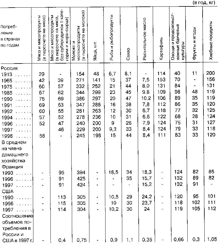 В структуре потребительских расходов населения основной вопрос — расходы на приобретение продуктов питания, поскольку именно это определяет в первую очередь физическое здоровье нации. В этой группе товаров недостаточное потребление таких основных продуктов питания, как мясо и мясные продукты, яйца, рыба и рыбные продукты, овощи и бахчевые, фрукты и ягоды, традиционно заменяется хлебными продуктами и картофелем. Потребление мяса и мясных продуктов непрерывно снижалось с 1990 г. с 75 кг на душу населения в год до 52 кг в 1996 г. (на 44,2%) и 58 кг в 1998г. (29,3%). Уровень потребления продуктов этой группы в настоящее время ниже уровня его потребления в 1985 г. и даже в 1975 г., когда он составлял соответственно 67 и 60 кг. Аналогичная картина по потреблению яиц, рыбы и рыбных продуктов, молока и молочных продуктов. Их среднедушевое потребление сократилось соответственно на 33,3, 25, 36,5%. В развитых странах структура потребительских расходов также менялась, но не ухудшалась (табл. 9).