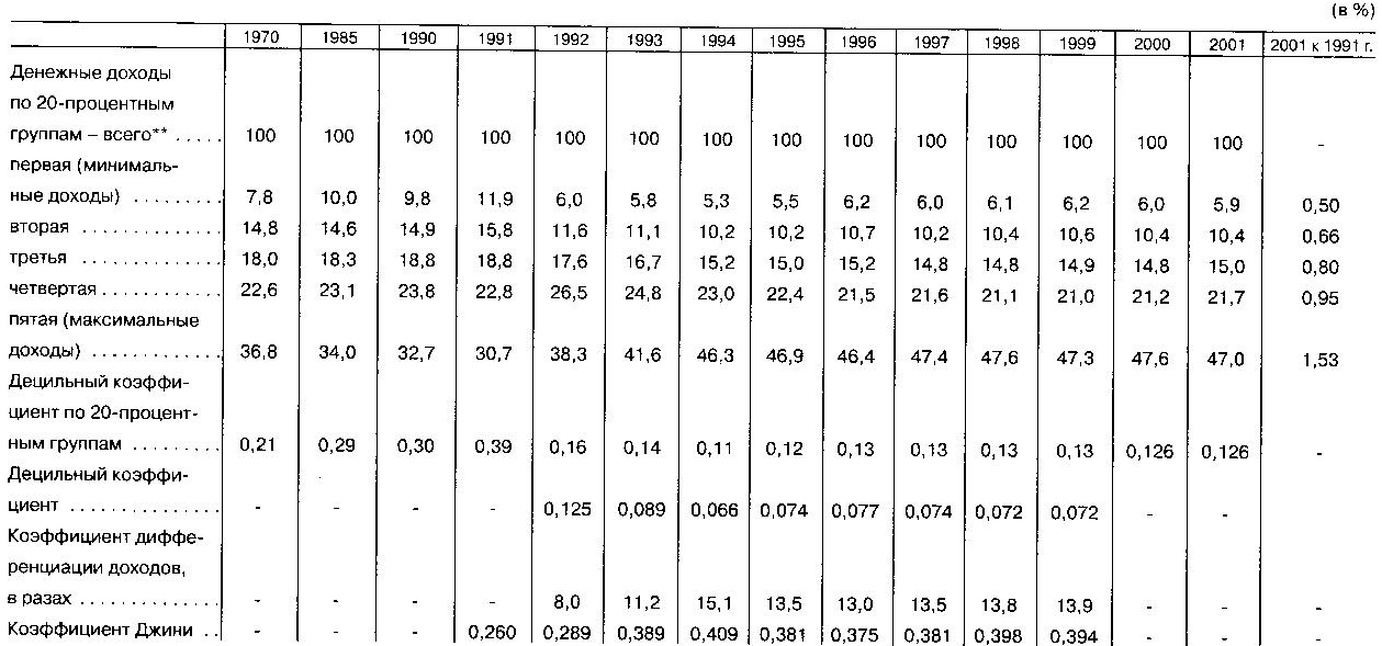 Одной из причин расслоения населения является изменение структуры доходов той его части, которая живет за счет найма на работу. За годы реформ в стране она резко изменилась: сократилась доля заработной платы при относительном увеличении социальных выплат, появились новые формы дохода — от предпринимательской деятельности и от собственности, которые бедная часть населения не имеет. За прошедший период сохранялись тенденции снижения доли заработной платы в структуре доходов, роста доходов от собственности, предпринимательской деятельности, доходов по ценным бумагам и проч. Доля оплаты труда сократилась более чем в 2 раза: с 69,9% в 1992 г. до 35,2% в 1999 г., что продолжилось в 2000 и 2001 г., соответственно возросли доли доходов от собственности и предпринимательской деятельности с 1,0 и 8,4% до 7,4 и 12,7% в 1999 г., в 2001 г. доля доходов от собственности сократилась до 5,6%, а от предпринимательской деятельности повысилась до 16,1%.
