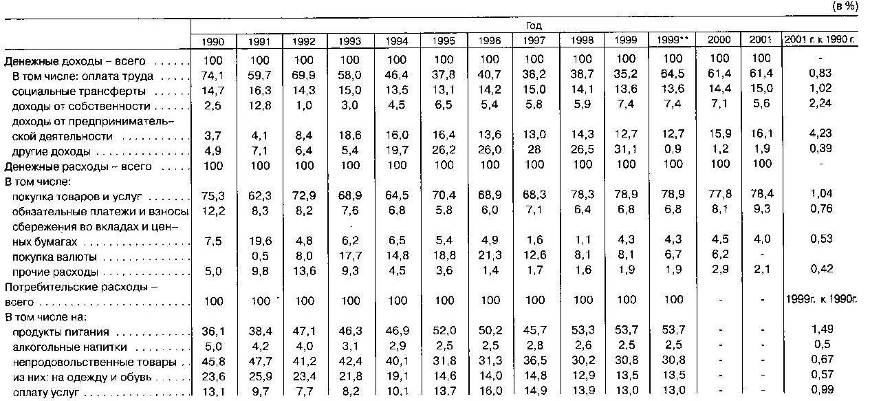 Вернемся к вопросу о структуре денежных расходов населения. В период с 1992 по 1997 г. стабильно высокими были расходы на покупку валюты и сбережения во вкладах и ценных бумагах - от 14,2 до 24,2% всех расходов. В 1992 г. и с 1998 по 2001 г. наблюдалось резкое снижение в этой группе расходов — с 19,6 и 22,9% до 5,3 в 1992 г. и 13,7% в 1999 г. и соответственно до 10,2% в 2001 г. Вообще доля статей расходов «сбережения во вкладах и ценных бумагах» и «покупка валюты» начиная с 1996 г. снижалась неуклонно с 23,7 до 10,2%. Одновременно росла доля статьи расходов обязательных платежей и взносов: от 5,8 в 1995 г. до 8,1% в 2000 г. и до 9,3% в 2001 г., увеличившись почти на 15%. Расходы на потребление возросли в 1992 г. на 10,6% (за счет резкого сокращения статьи расходов «сбережения во вкладах и ценных бумагах»), в 1995 г. — на 4,9 (за счет уменьшения возросших в предыдущий период расходов на покупку валюты) и в 1998 г. на 10,0% (по этой же причине), восстанавливая всякий раз уровень 1990 г. Наблюдавшийся в 2000-2001 гг. рост потребительского спроса продолжался в основном за счет снижения доли сбережений населения. Их низкий уровень подводит к выводу, что в последующие годы при сохранении тенденций экономического развития в стране покупательский спрос будет ограничен. Проблема фактического потребительского спроса остается очень острой и значимой для всей страны. Официальная статистика показывает не только сравнительно низкий уровень фактического конечного потребления в домашних хозяйствах по сравнению с началом реформ — 1990 г., но и недостаточно неблагоприятную динамику их структуры.