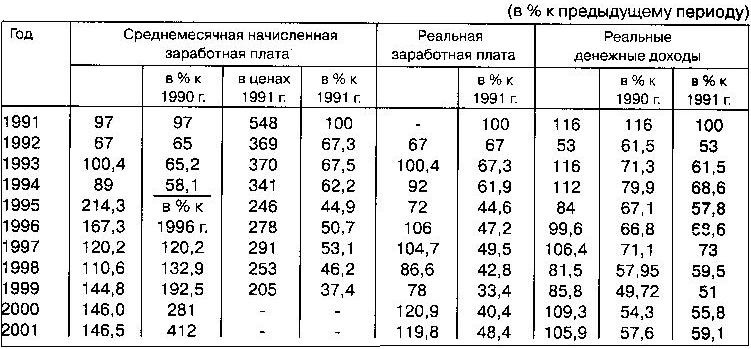Все это позволило повысить темпы экономического роста на 8,3% в 2000 г. и 5% в 2001 г. увеличить реальную заработную плату на 20,9 и 19,8% в 2000 и 2001 гг. За эти годы объем производства промышленности и сельского хозяйства вырос соответственно на 17,4 и 13,4%. Но все же, по данным Госкомстата, объем производства в 1999 г. и 2001 г. по сравнению с 1990 г. составил соответственно 49 и 57,6% в промышленности, 58,3 и 66,1% — в сельском хозяйстве. Реальные денежные доходы к 2000 г. сократились на 50,28%, т.е. стали меньше более чем в 2 раза по сравнению с 1990 г. В целом за 2000-2001 гг. их удалось поднять на 15,7%, но по сравнению с 1990 г. их величина составила всего лишь 57,6%. Среднемесячная начисленная заработная плата за 1990-1999 гг. возросла в 4 раза, за следующие два года — еще в 2 раза. Но среднемесячная начисленная заработная плата в ценах 1991 г. сократилась почти в 3 раза, достигнув 34,7% уровня 1991 г. Если сравнивать динамику начисленной и реальной заработной платы, то положение будет еще хуже. Так, среднемесячная начисленная заработная плата (в ценах 1991 г.) за период с 1991 по 1999 г. снизилась на 62,6% и составила 37,4% уровня 1991 г. Реальная заработная плата за этот же период уменьшилась на 66,6%, она составила 33,4% уровня 1991 г. - на 4% меньше по сравнению с номинальной заработной платой (табл. 4). Разница между динамикой реальной заработной платы и реальных денежных доходов к 1999 г. и 2001 г. оставила соответственно 17,6 и 10,7% общего уровня доходов 1991 г.