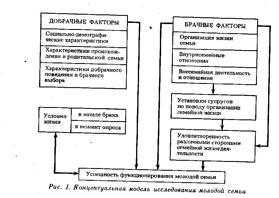 Разумеется, для исследований семьи необходимы и другие модели, в которых в качестве зависимых переменных выступают намного более сложные (с точки зрения процедур измерения) показатели. Так, например, нами совместно с Т. А. Гурко была разработана следующая концептуальная модель факторов, влияющих на успешность функционирования молодой семьи " (рис. 1).