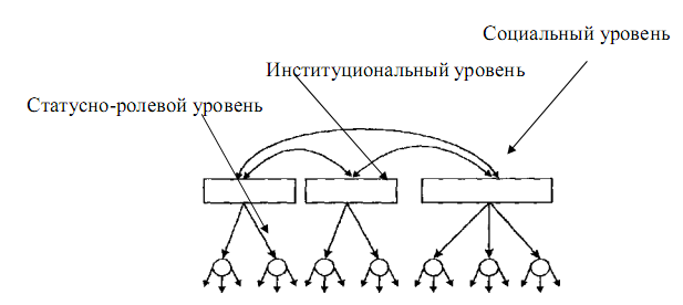Любое общество можно представить в виде множества статусно-ролевых позиций, причем, чем их больше, тем сложнее общество. Однако статусно-ролевые позиции не являются простым нагромождением, лишенным внутренней гармонии. Они организованы, соединены между собой бесчисленными нитями. Организованность и упорядоченность обеспечиваются благодаря более сложным структурным образованиям — социальным институтам, общностям, организациям, — которые связывают статусно-ролевые позиции между собой, обеспечивают их воспроизводство, создают гарантии их устойчивости и составляют второй, институциональный уровень общества [7, с. 75]. На рис. 1 этот уровень организации социальных взаимодействий изображен в виде прямоугольников.