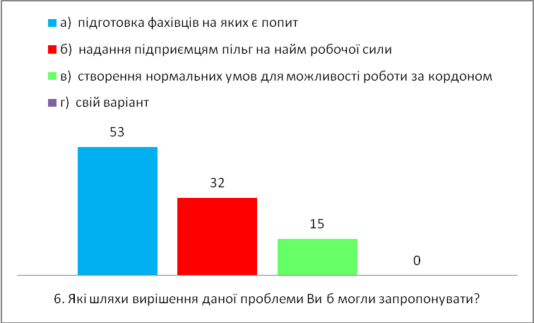 6. 53% респондентів вважає, що проблему безробіття можна вирішити шляхом перепрофілювання безробітних, тоді як 32% вважає, що потрібно надати підприємцям нормальні умови для найму і також 15% рахує, що потрібно створити нормальні умови для можливості роботи за кордоном.