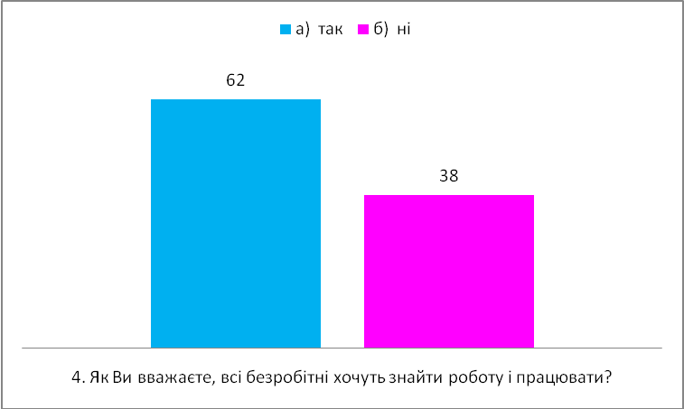 4. На питання чи всі безробітні хочуть знайти роботу і працювати все ж таки більша частина опитаних (62%) вважає, що так і 38% в це не вірить.