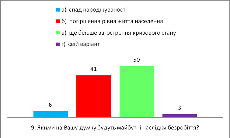 9. Яких наслідків слід очікувати в майбутньому від безробіття ми запитали у опитаних респондентів і отримали наступні результати: це призведе до ще більшого загострення кризового стану – 50%, погіршиться рівень життя населення – 41%, зменшиться народжуваність – 6%, і 3% не знає, що буде.