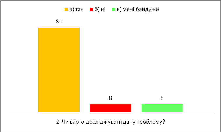 2. Основна частина респондентів (84%) вважає, що дана проблема потребує дослідження, 8% вважає, що не потребує і такі ж кількості байдуже.