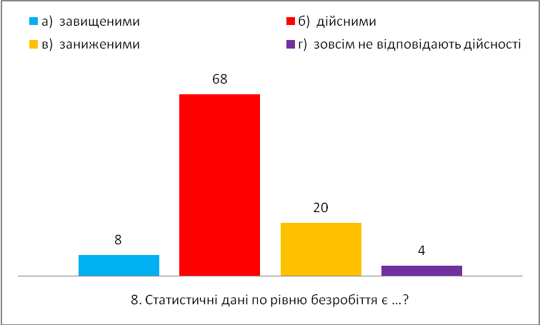 8. В Україні по безробіттю ведеться статистика, і ми запитали респондентів чи вірять вони їй: і таки 68% вірить, 20% вважає, що показник занижений, 8% – завищений і 4% вважає, що він зовсім не відповідають дійсності.