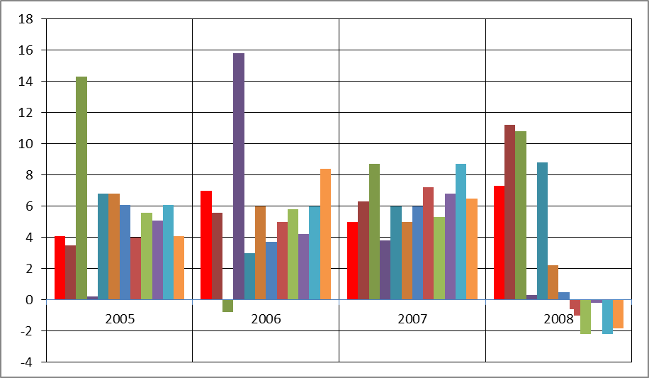 Рисунок 2 - Рост прибытий в % по сравнению с тем же периодом предыдущего года 2007, 2008 гг. (UNWTO Tourism Barometer. Edition 2009_01)