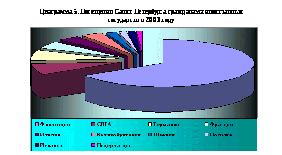 Приведем в виде диаграммы данные «горячей десятки» стран жители, которых посетили Санкт-Петербург как туристы в 2003 году14. (диаграмма 5)