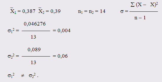 Гипотеза (Х>1> = Х>2>) отклоняется с вероятностью q = 1 - = 1 - 0,05 = 0,95.