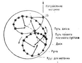 Путь диска в финальном усилии должен проходить по дуге наибольшего радиуса (рис. 4). Диск вылетает одновременно с окончанием отталкивания ногами. Отталкиваясь, правая нога отрывается от опоры непосредственно перед вылетом диска и выставляется вперед на смену левой.