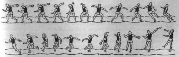Финальное усилие. Ставя правую ногу на грунт после поворота из описанного выше положения, метатель переходит к выполнению финального усилия. В это время левая нога должна быть подготовлена к приземлению. Желательно ее быстрее ставить на грунт вслед за правой, так как активная часть финального усилия может начаться лишь в двухопорном положении. К этому времени диск максимально удален от точки вылета. Соблюдение этих условий позволит лучше приложить силы к диску по наибольшему пути.