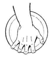 Держание диска. В опущенной руке диск должен опираться на ногтевые фаланги согнутых пальцев, кроме большого, который лишь касается плоскости диска (рис. 1). Кисть при этом немного согнута в лучезапястном суставе, и верхняя часть обода касается предплечья. Пальцы не следует ни плотно прижимать друг к другу, ни напряженно разводить, так как в обоих случаях управление диском ухудшается.