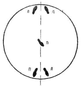 Левая нога ставится на грунт у передней части круга передней частью внутренней стороны стопы. Следы ног (левой при исходном положении, правой и левой в положении для финального усилия) находятся почти на одной линии, если правая нога ставится в центре круга (рис. 3). При отталкивании правая нога поворачивается до направления метания. В это время метатель, напрягая мышцы живота, не должен прогибать туловище назад. Следует избегать распространенной ошибки, заключающейся в поспешном и чрезмерном вращении правой ноги в момент опоры на грунт.