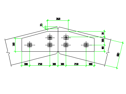 Торцы клееных блоков ригеля в узле соединяем впритык не по всей высоте, а со срезом крайних досок под углом по 25 мм для большей шарнирности узла и предотвращения откола крайних волокон при повороте элементов шарнирного узла. Боковая жесткость узла обеспечивается постановкой парных накладок сечением 200x125 мм на болтах d=20 мм.