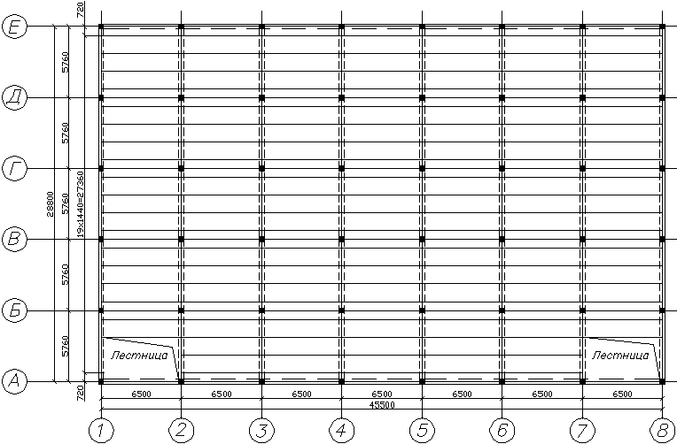 Размеры здания в плане в осях: 28,8 х 45,5м.