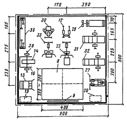 Рис. 12 - План помещения размером 99 м с расстановкой в нем тренажеров из набора КАП-2 (размеры в сантиметрах)
