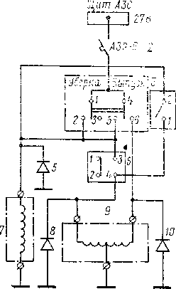 1 — шина на щите АЗС; 2 — выключатель АЗР-б: 3—переключатель 2ППНГ-15К уборки-выпуска шасси; 4 — выключатель ВНГ-15ГК отключения блокировки шасси; 5, 5. 10 — диоды Д'2Н; 6 — выключатель концевой ДП-702 блокировки уборки шасси на земле; 7 — крак электромагнитный ГА-140 зарядки гнд-роппевматического а кку? гул я тор а -т2 (см. рис. 5.1); .9 — кран электромагнитный ГЛМ2/1 уборки-выпуска шасси