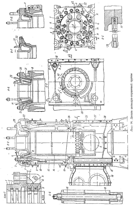 Блок цилиндров (лист 96) состоит из отдельных рубашек цилиндров 13, соединенных болтами 9 в две секции, между котороми размещен приводной отсек. Рубашки цилиндров, выполненные из перлитного чугуна, имеют люки 10 для осмотра полостей охлаждения. Охлаждающая вода подводится к цилиндру в нижней части и отводится в крышку 20 по двум чугунным патрубкам 22.